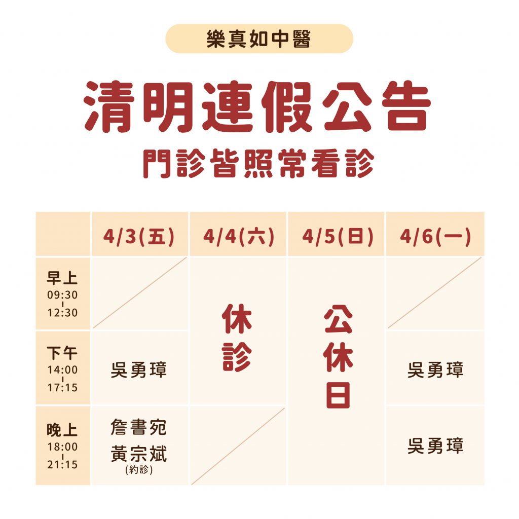 【樂真如】清明連假門診異動公告 發佈日期: 2026 年 3 月 29 日2026 年 3 月 29 日 作者: zhenju 清明連假期間 4/4 週六休診一天 4/5 週日公休 其餘皆照常看診 – 門診時刻詳見下圖