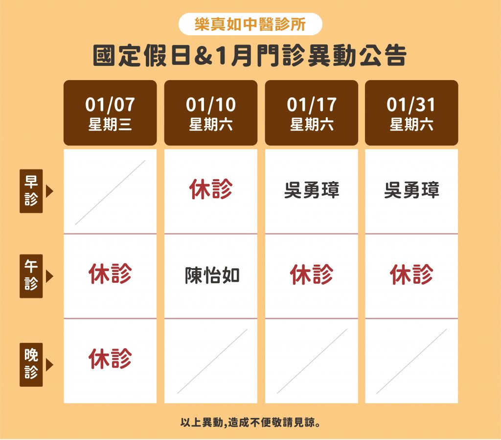🔸01/01(四) 元旦 早上、下午休診;晚上照常看診。